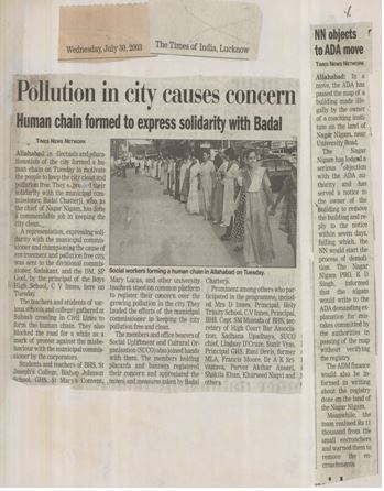 Even when Shri Chatterjee was the Municipal Commissioner of Allahabad he had to face the onslaughts of some selfish rowdy elements because of his “Operation Clean Programme” who attacked his office but the enlightened citizens of Allahabad formed a human chain as a protest against the vandalism in favour of Shri Chatterjee. This was a unique support and the only of its kind in India when people thronged the road of Civil Lines and formed a Human Chain from the Coffee House to the Subhash crossing in support of Shri Chatterjee in **** 2012. Again when the various negative elements of society and especially the politicians for their own selfish interest were successful in getting him transferred from the post of Municipal Commissioner, the intellectuals of Allahabad assembled in the Bishop Johnson Inter College, Allahabad to condemn his transfer. The citizens included Judge of the High Court. Vice Chancellor, Professors and other intellectuals besides octogenarian Ex Minister Late P.D. Tandon who came in a wheelchair to voice the protest