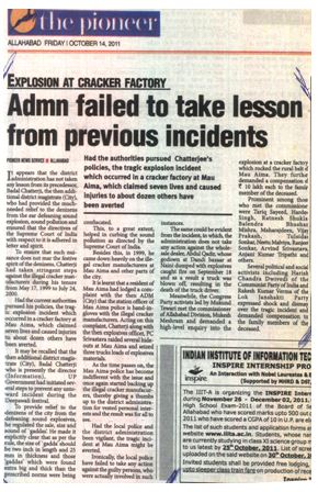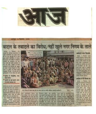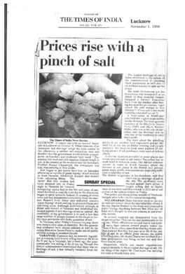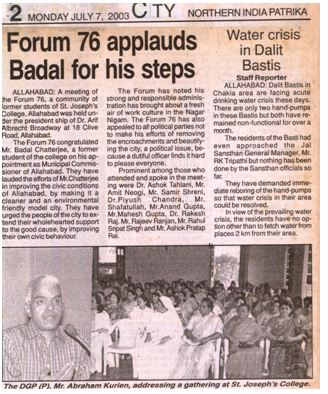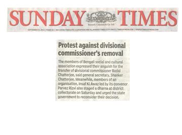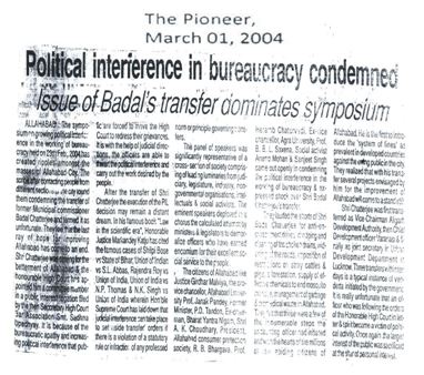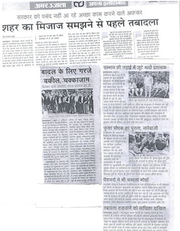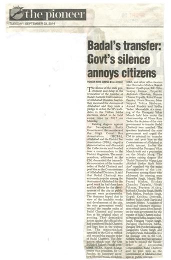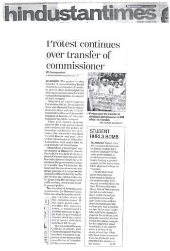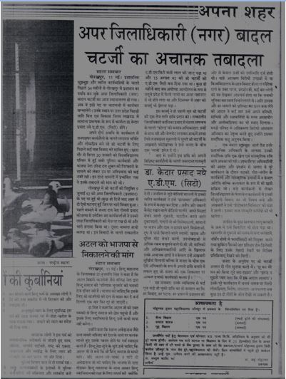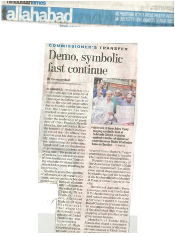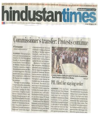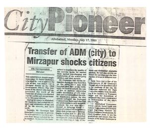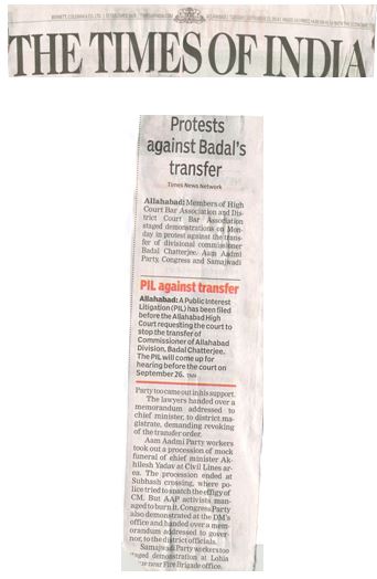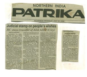 When Shri Badal Chatterjee was transferred from the post of Additional District Magistrate City Allahabad to Mirzapur as Chief Development Officer in July 2000 as he was implementing rules and regulation in the city, and making an attempt to establish the rule of law started. It was at Allahabad which was the only city in India where the prices of onion and potato was controlled by him in the year 1999 (because of the price hike the Bhartiya Janta Party government lost in the Assembly Elections in Delhi ).*******. Their was a panic that there is a scarcity of salt the entire State and the people went berserk in purchasing it but from prompt action taken by him brought the matter under control in Allahabad whereas in other Districts of Uttar Pradesh it prevailed for 3-4 Days. He controlled the sound pollution banned the sale of illegal crackers****** and because of his compassion for animals he tired to stop the injecting of Oxytocin on the innocent milching cattles.***9 The good citizens of Allahabad protested in his favour and the Teachers’ Association of the University of Allahabad (known as the Oxford of the east) filed a Public Interest Litigation (PIL) at the High Court of Allahabad. For the then Judges of Allahabad the good work of Shri Badal Chatterjee did not go unnoticed and they gave a stay order in his favour. The next day the Northern India Patrika in its front page carried out the news “Judicial Stamp on People’s wishes''.