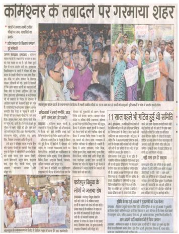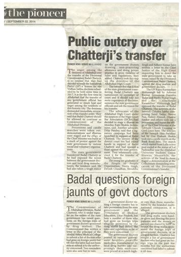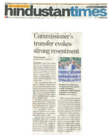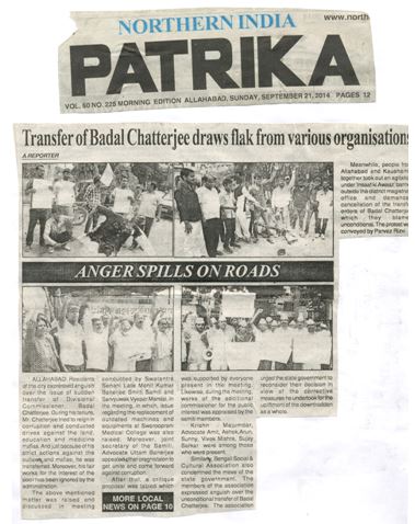 People of Allahabad were very happy when he became the Commissioner of Allahabad Division Allahabad in February 2014. During his short tenure of seven months he made the people of his division realize the immense power and authority of the institution of Divisional Commissioner. He made medical facilities available free of cost to the needy and poor people of the Allahabad Division. He freed the masses from the exploitation of some of the greedy and selfish Medical practioners who inspite of receiving non-practising allowance were neither teaching the medical students nor attending them in the government medical college and were out to disgrace the noble profession and without adhering to the oath of Hippocrates they were siphoning the patients to the private hospitals so that they could flourish on their illegal private practice at the cost of the poor patients. He was successful in freeing the Swarup Rani Medical College from the tentacles of touts and middle men. He provided them medicines free of cost from the government hospitals. He also revealed the illegal practice of selling the medicines at a high rate by the drug owners with the connivance of the doctors, Several surgeons were damaging the surgical instruments in the medical college so that the patients are forced to go to the nursing homes illegally running by them. They were putting pressure on the Senior Residents not to treat the serious patients and divert them to their respective private nursing homes other wise they will fail in their MS Examination. During the drive about 17 private ambulances of the touts who use to coax and carry the patients from medical college premises to the nursing homes were seized. Due to Mr Chatterjee’s untiring efforts the bed occupancy of the medical college which was limited between 25-30% was increased to almost 100%. He floated the idea of purchasing generic cheaper and effective medicines from the market in case of emergency, and eventually was successful in creating a dent in the impregnable fortress of the Drug Racketeers. He ensured the presence of the doctors and teachers in the rural areas by mobile tracking system, which none had ever thought of. He made it compulsory for the doctors of Primary Heath Centres to attend and provide free medicines to the rural folk who earlier were left with no option but to go to the nursing homes of the cities were they were badly exploited. The availability of the teachers increased the attendance of the rural children which resulted in the increase of Mid Day Meal. The government however yielded before the negative stake holders of the society and he was transferred to Lucknow as Commissioner Food Safety and Drug administration UP, but the people of Allahabad and other districts of Allahabad Division did not take the decision of the government as a lying down fact. His transfer sent shock waves throughout the division.. There was a tremendous uproar and public outcry and all sections of people started protesting in the form of dharna, candle march, road blockade, even the members of the ruling party came out on the streets. The Lawyers of Allahabad High Court staged a demonstration at Subhash Crossing in Civil Lines. Banners were set up in various parts of the city as a mark of protest. The natural upsurge continued for five days unabated, the press and the electronic media also decried the action of the government. People have heard about protests to transfer an official on grounds of corruption and non performance but never in the annals of history in India it has ever been heard that masses were raising their voice to stall the transfer of an upright official. The Google has termed his extraordinary work as’ Badal Chatterjee Singham ’( Singham is a hindi film where the officer was upright and was able to bring ‘Good Governance’ despite of many hurdles ) which can be viewed on the Google